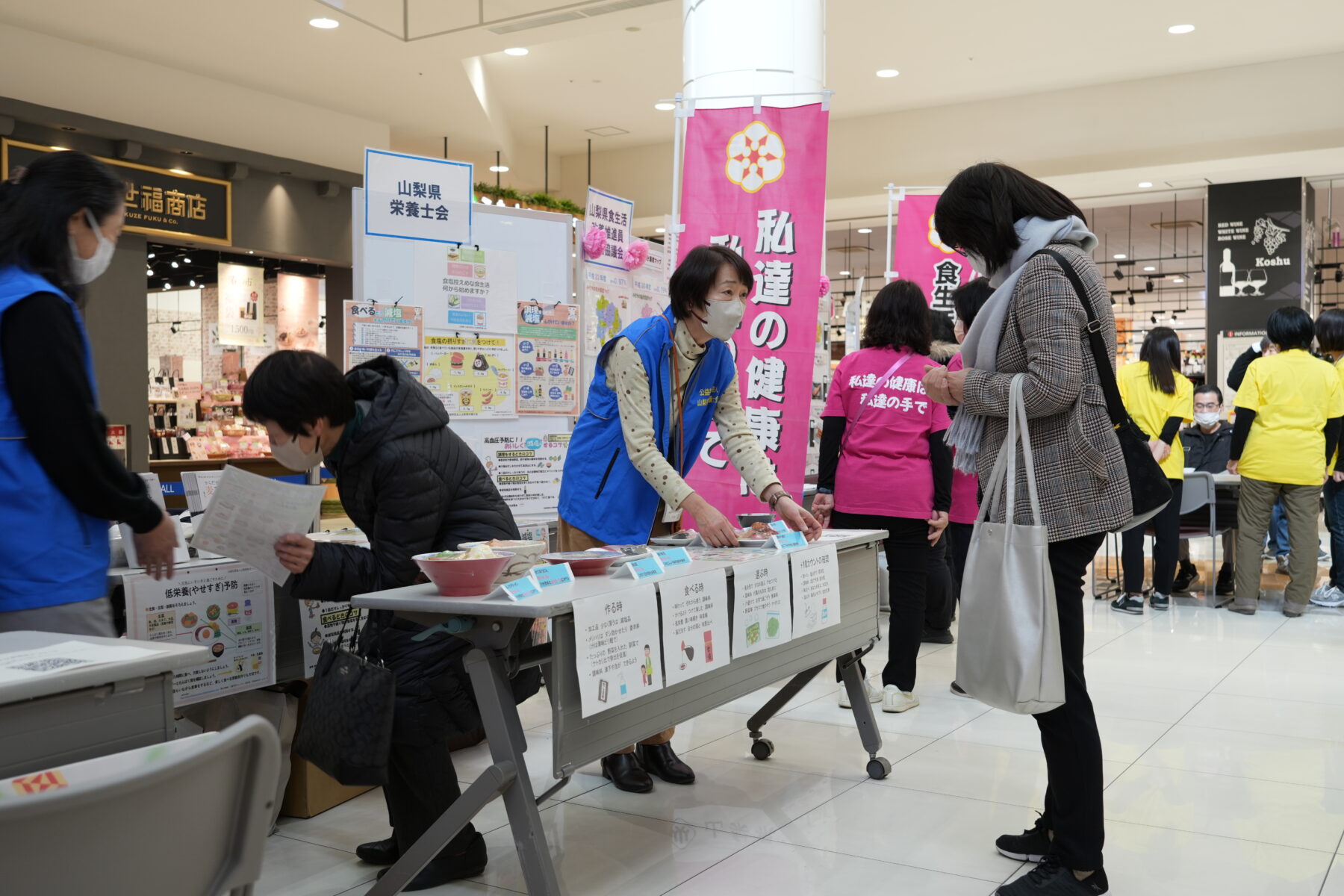 やまなし減塩プロジェクトの代名詞ともいえる「やまなし減塩フェスタ」は2024年度より開始されました。山梨県をはじめ様々な企業・団体・大学生らが参加し、初回にもかかわらず、総勢50名を超えるスタッフが集う大盛況のイベントとなりました。子供から大人まで世代を超えて楽しみながら減塩や健康のヒントを学べる企画となっております。本ホームページをご覧のみなさまもぜひお立ち寄りください。最新のイベント情報は山梨大学腎臓内科のホームページやFacebookなどでお知らせしていきますので是非チェックしてみてください。