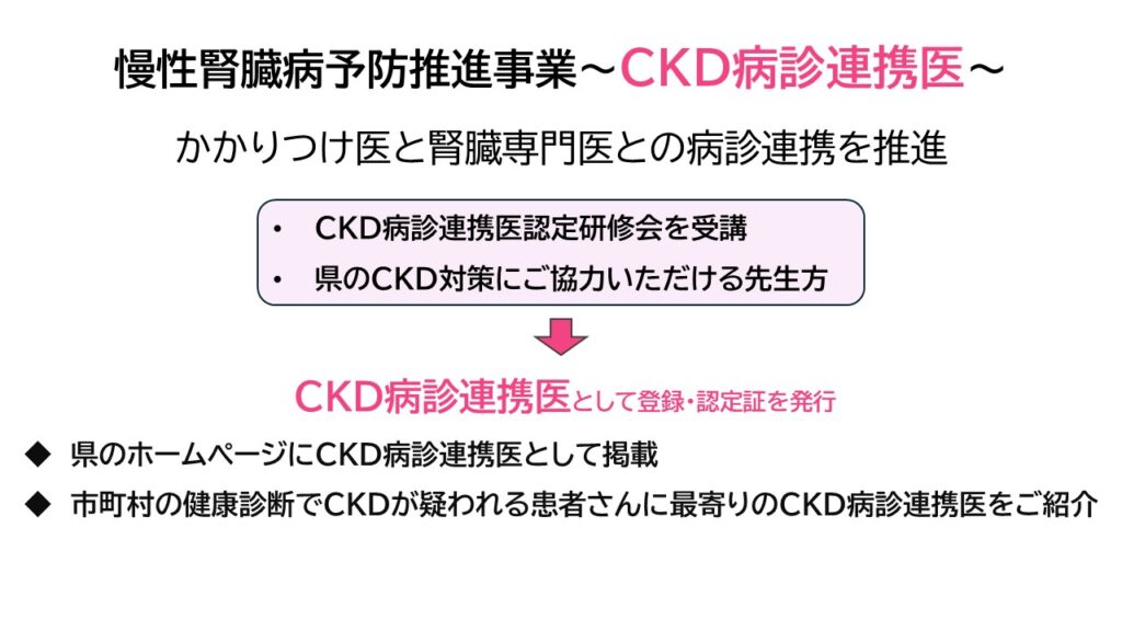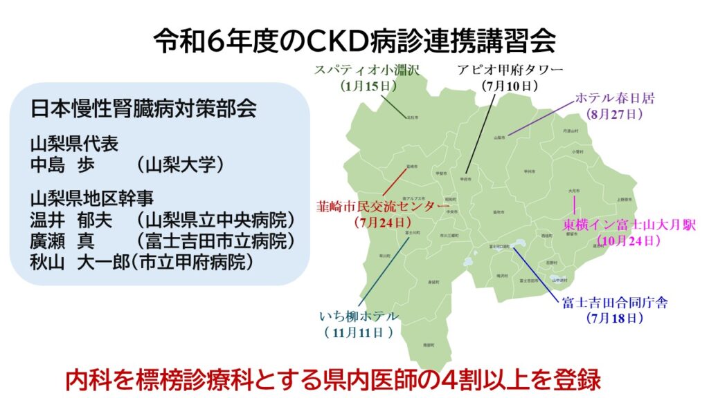 山梨県では、腎臓病の患者を早期に発見し、進展を抑制することを狙い、新しい腎臓専門医紹介基準を設けました。これにより、かかりつけ医の先生方がスムーズに腎臓専門医と連携し、患者さんの状態に応じた適切な診療を提供できる体制を整えました。また、かかりつけ医のCKD診療の基本方針として、GFRと尿所見について腎臓内科医と情報を共有することや、減塩と適切な水分摂取について確認と指導をすることを新たに定めました。(山梨県慢性腎臓病対策部会)
